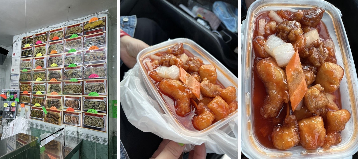 The menu features classic Chinese takeaway options including sesame prawn on toast, chicken sweet and sour, and crispy wontons, all available for reasonable prices.